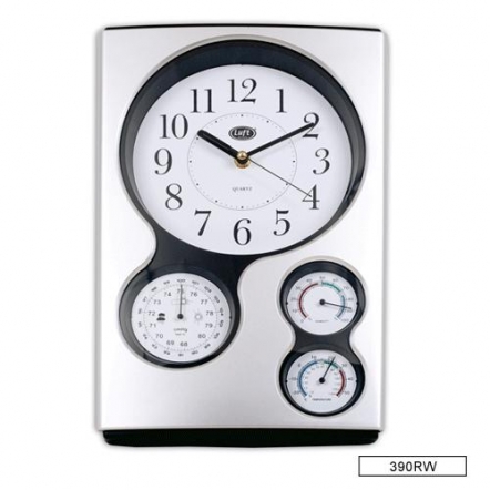 Con reloj para pared, termohidrómetro, y barómetro para pared.Temperatura, humedad relativa ambiente y presión atmosférica. Medidas: 213x105x63 mm Rangos: T: -20 °C a +50 °C H: 0 % a 100 % PA: 890 hPa a 1060 hPa